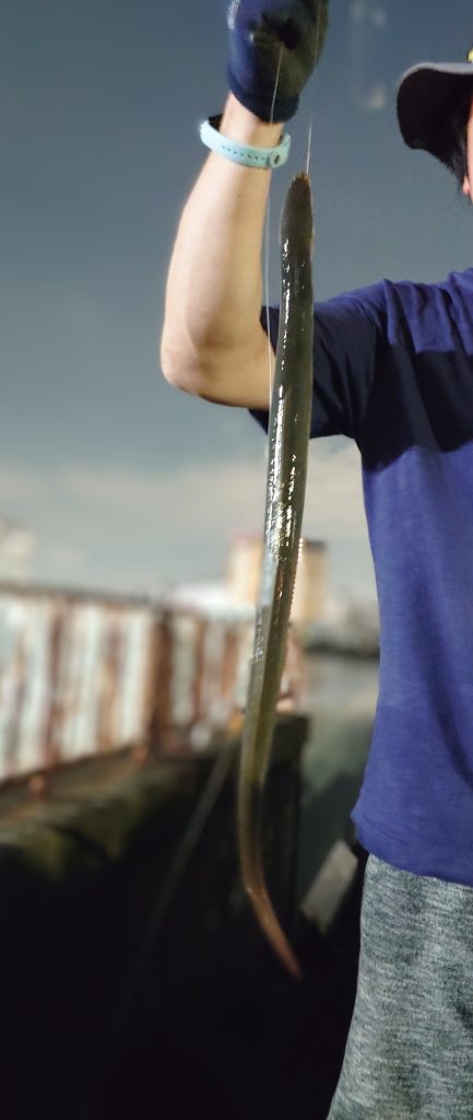 釣り開始から何度か当たりはあるものの餌だけ食べられたり、針がかりしなかったりと魚の気配は感じられる数時間でしたが、潮止まりからの30分後、ようやく私の竿にヒット!大物を予感させる強い引きを味わいながら水面から引き抜くと60cmオーバーの黒々太い天然鰻。まさに『夏の夜の夢』の一匹。