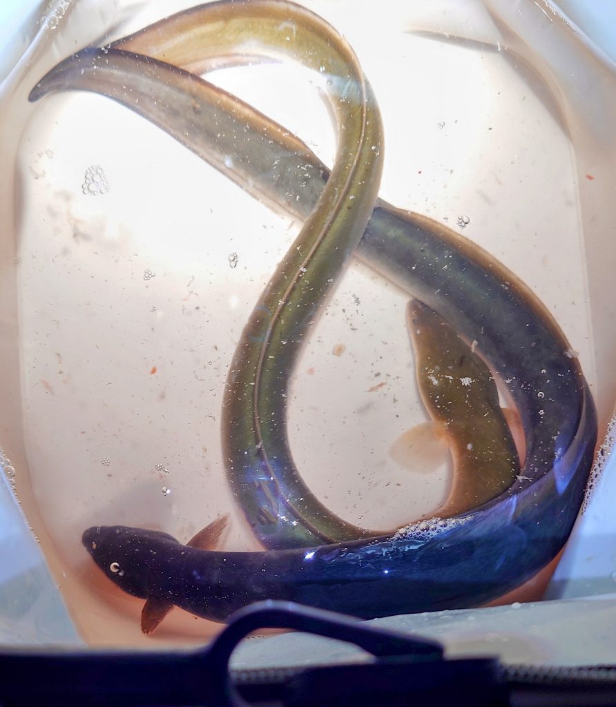 その直後に釣友にもヒット!置き竿がグッーと曲がって合わせもしっかりと決まり、上げてみると同じ位のサイズの天然色をした綺麗な鰻でした。
