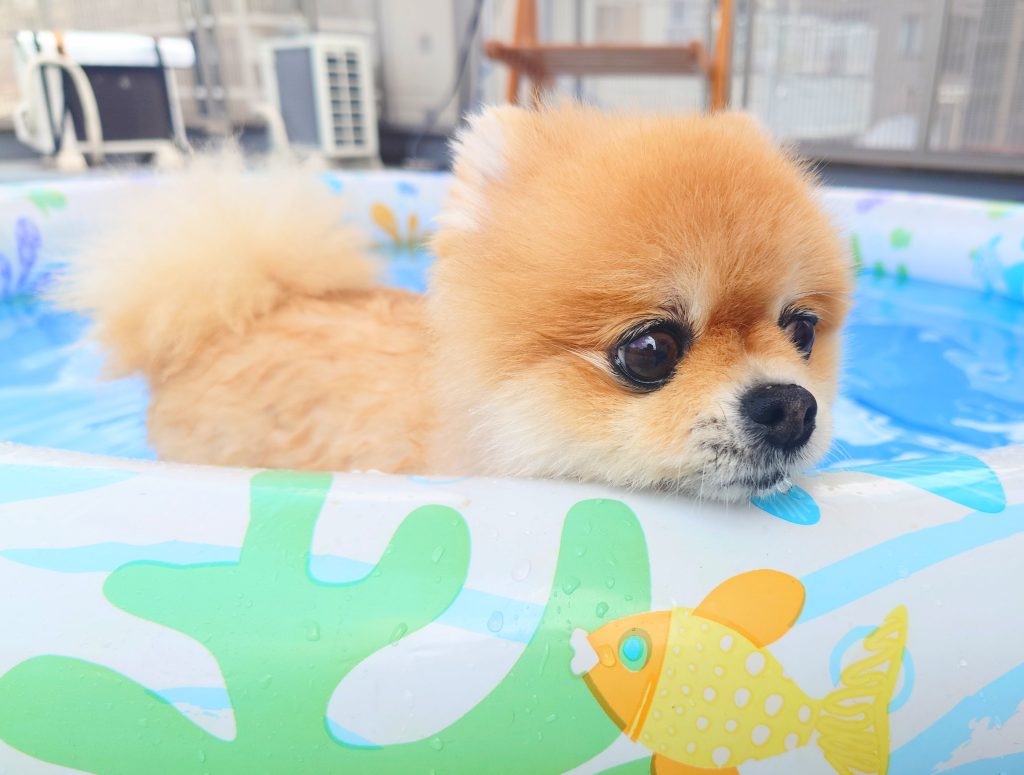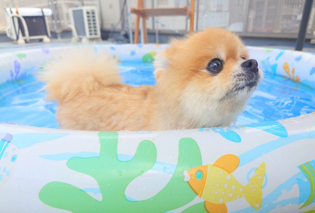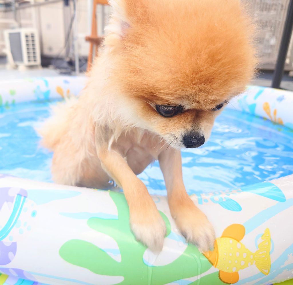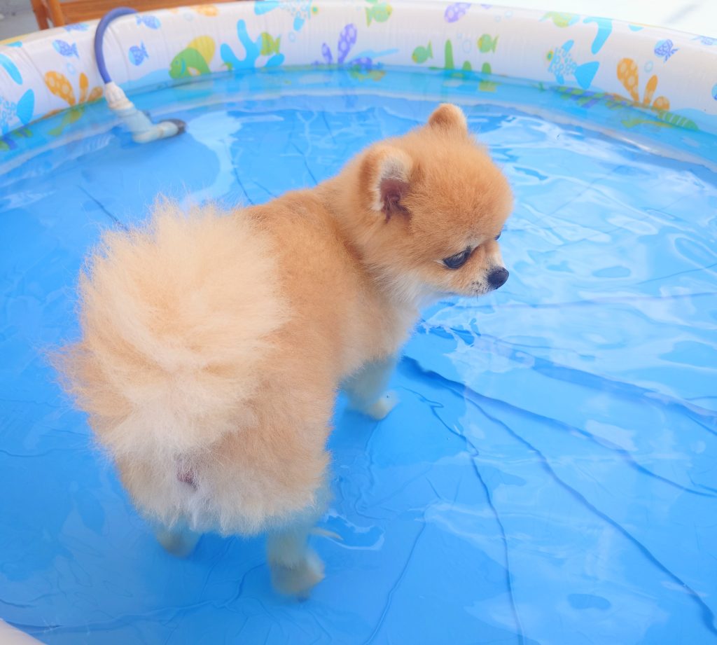 お盆休みの日曜日、小さなビニールプールの中でピピタンは今年の初泳ぎをしました。