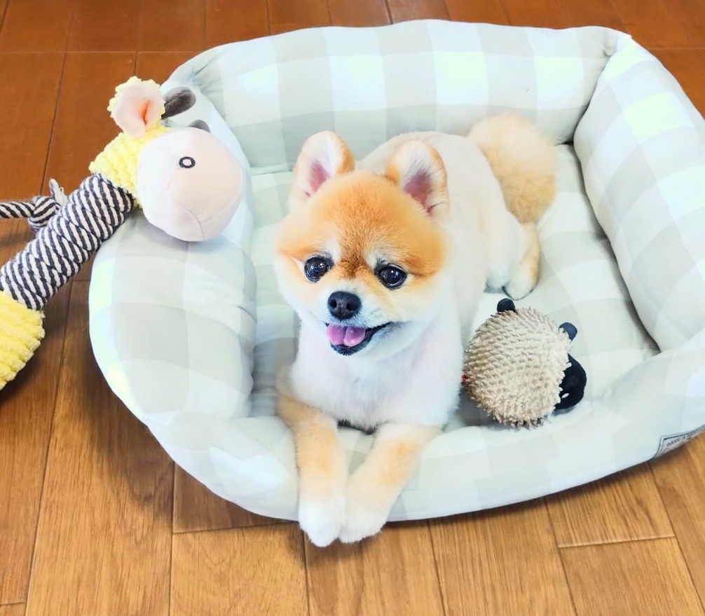 ピピタンベッドでリラックス。今回も大分伸びていたらしくカット後は一回り小さい豆柴ピピタンになって帰ってきました。スッキリして気持ちよさそうです😊
