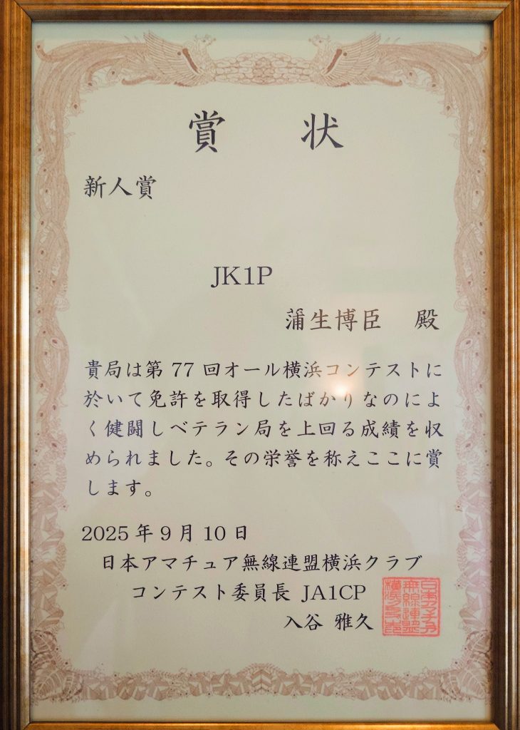 アマチュア無線を始めて9月で3年が経ちました。開局後しばらくして『横浜コンテスト』で新人賞を受賞し、賞状と副賞に144MHz帯用のデルタアンテナも頂き、とても嬉しかったのを思い出します。当時、授賞式にも参加させていただき、その際に『新人賞は1回だけだから』と言われていたんですが、今年なぜか2度目の受賞してしまいました😅開局3年に満たないビギナーなので再度選ばれてしまったようです。