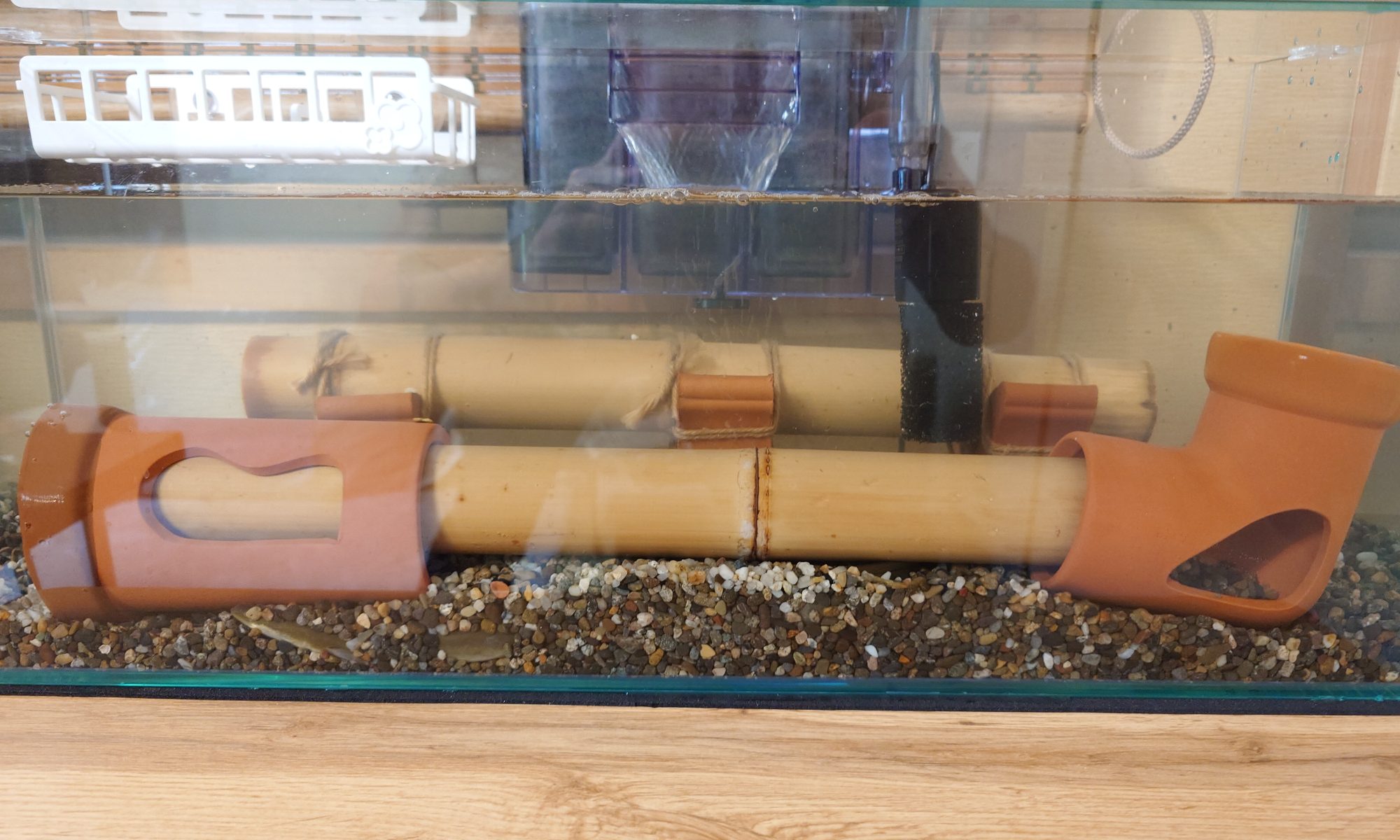 と言っても蒲生接骨院のことではありません😅先日の釣行で釣った3匹のウナギ達を一回り大きな新しい水槽に移し、場所もキッチンから私の部屋へ移動しました。これで夜の明るさを避けることができ、夜行性のウナギは元気に水槽の中で活動することができます。新居には新たに竹筒を2本設置したので、いつもその中で気持ち良さそうに身を潜めています。最初は食べなかった餌も最近は少しづつ食べるようになってきました。我が家の環境にも慣れてきてくれたかな😉大きくなるのが楽しみです。