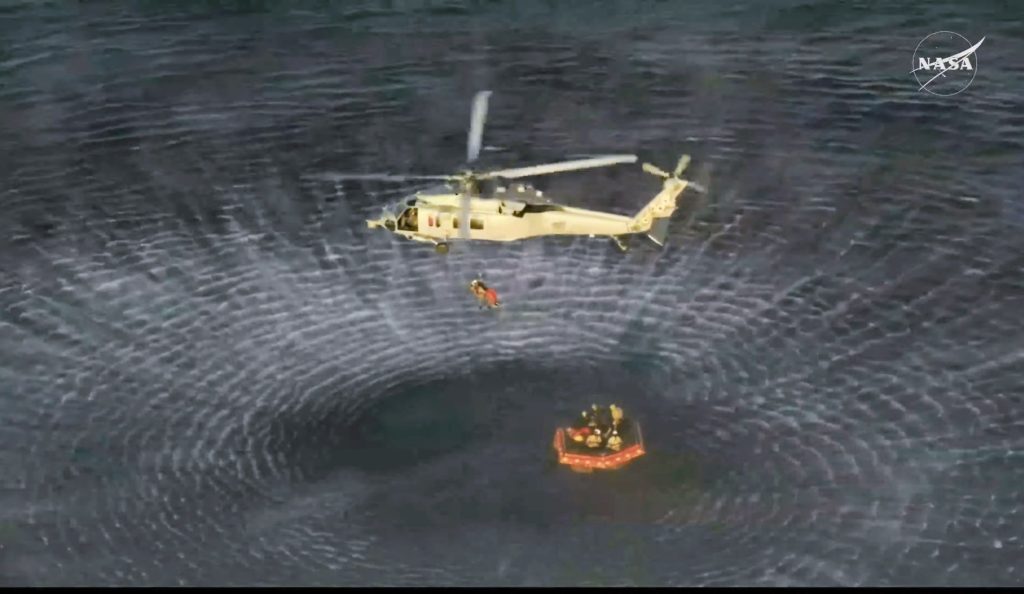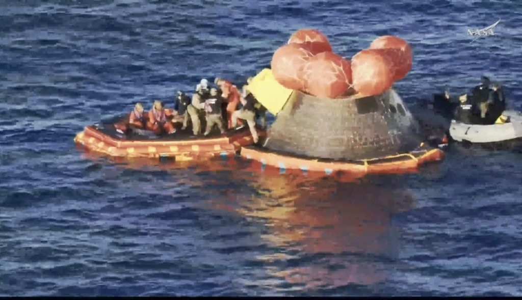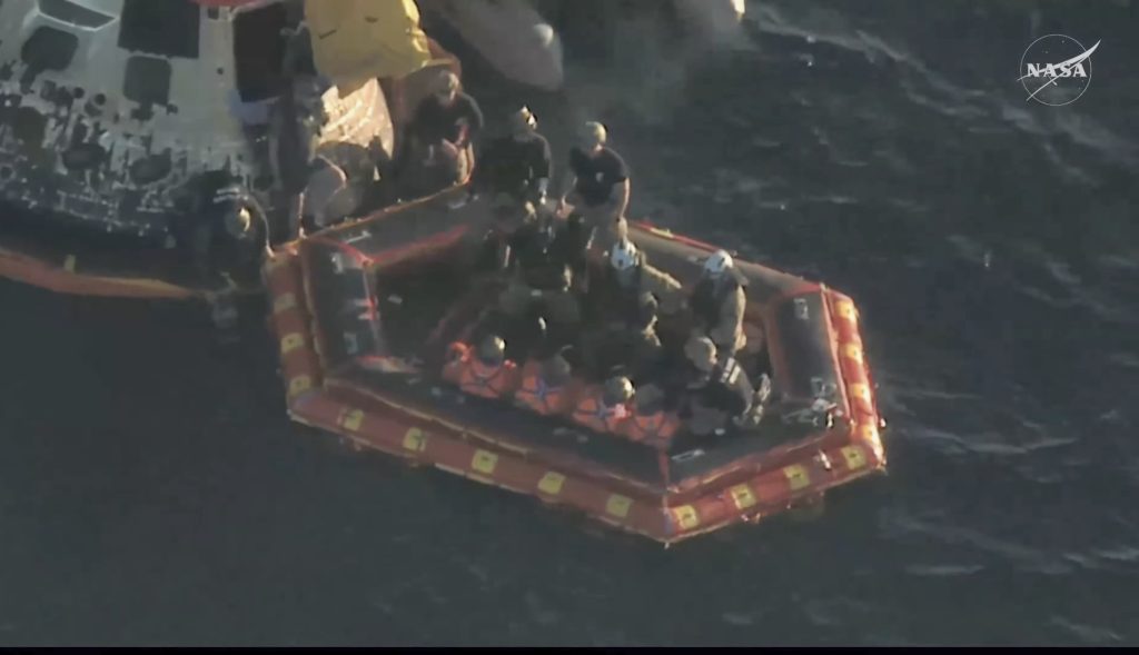 回収部隊がゴムボートでOrion宇宙船のクルーモジュールへ接近し、膨張式のいかだを展開。一人づつクルーが搬出されていきます。