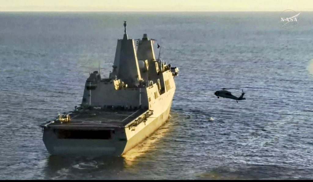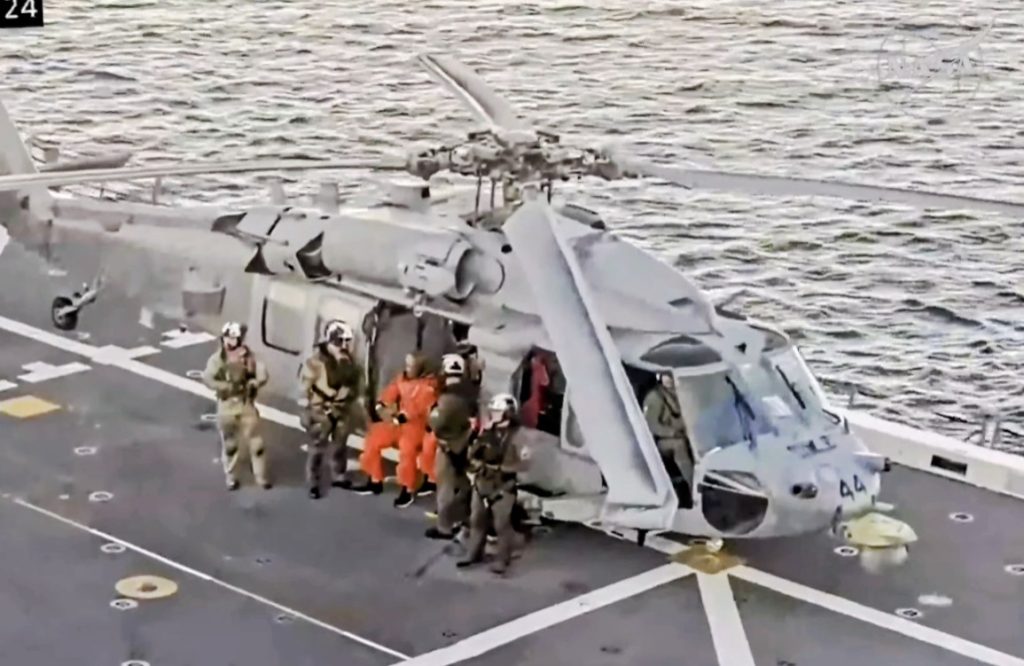 搬出されたクルーはヘリコプターに収容され、回収を担当するアメリカ海軍のドック型輸送揚陸艦「USS John P. Murtha(ジョン・P・マーサ)」へと向かいます。