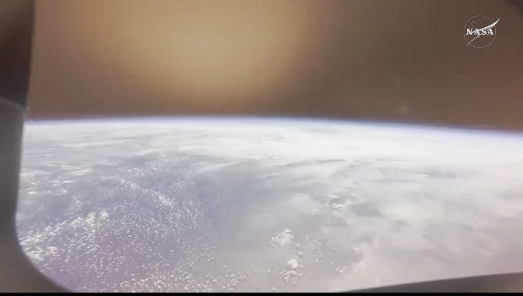 大気圏へ突入し、後方まで摩擦によって火がまわっているのが画面からもわかります。画面上方のオレンジ色がその炎🔥です。その後すぐにブラックアウトとなり交信が6分間途絶えます。